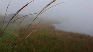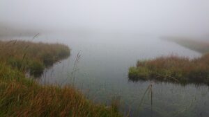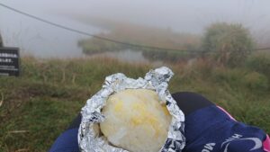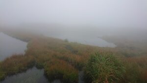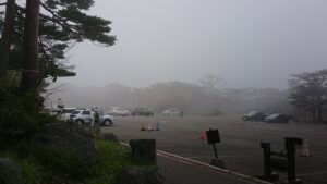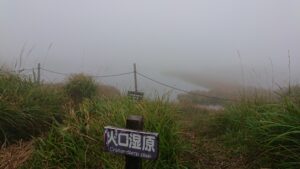 20分くらいゆっくり誰もいない火口湿地で霧が晴れるのを待つ。